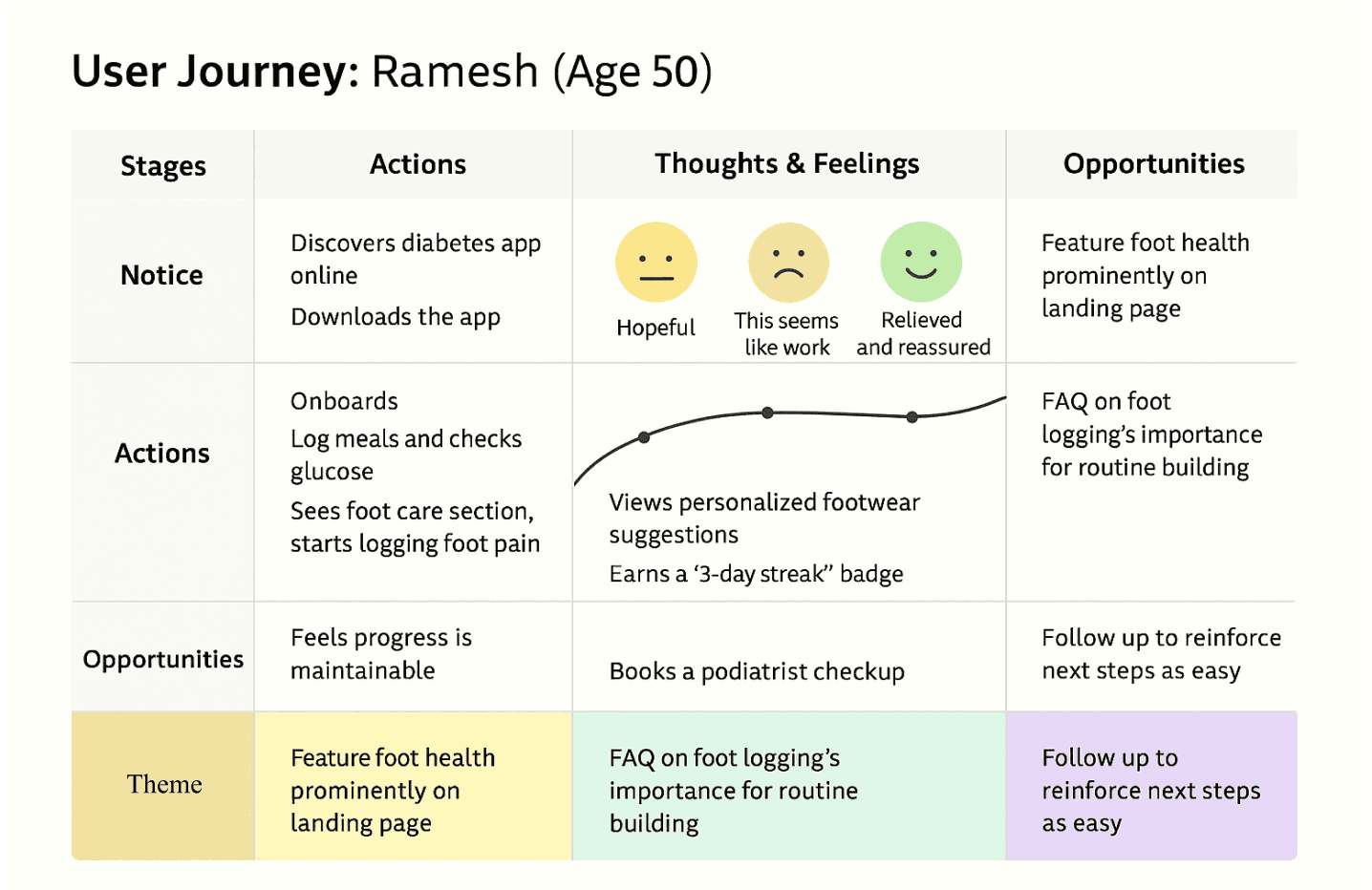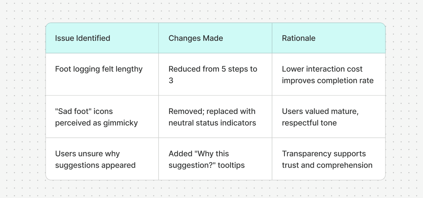 2 rounds of testing (8 + 10 participants) Key changes: Reduced foot logging from 5 steps → 3 Removed "sad foot" icons (users found them gimmicky) Added "Why this suggestion?" tooltips Result: 83% opened twice in 3 days, 90% would recommend