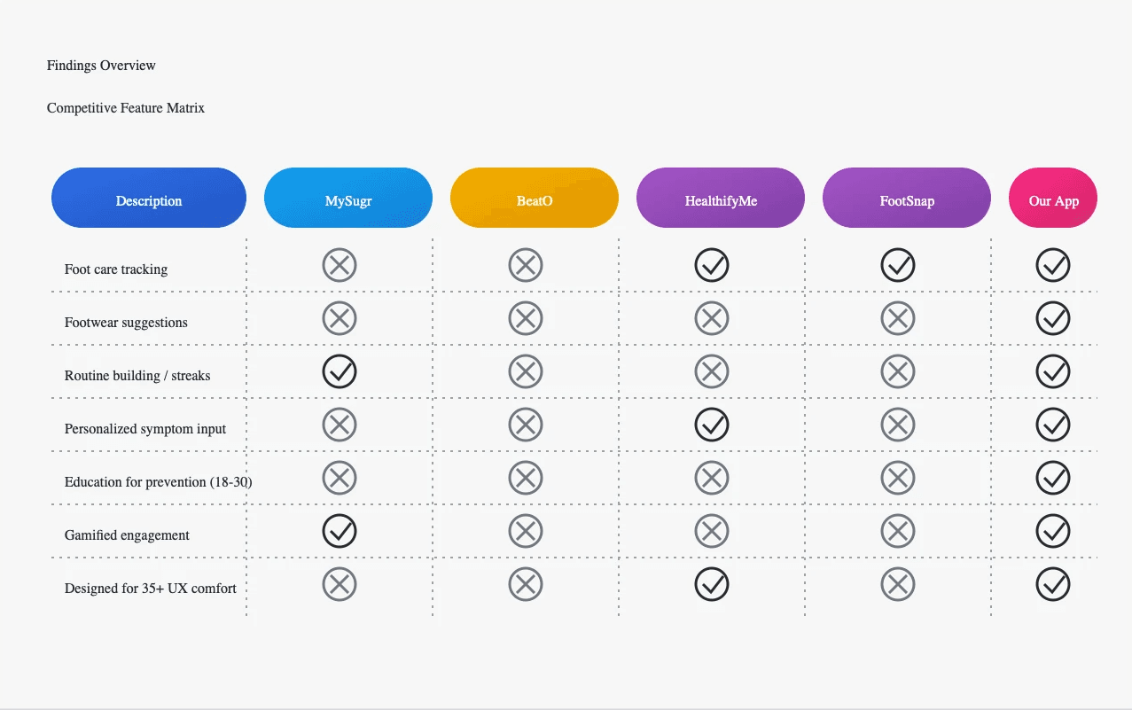 Competitive analysis of 7 diabetes apps found zero dedicated foot care features; footwear guidance was entirely absent.
