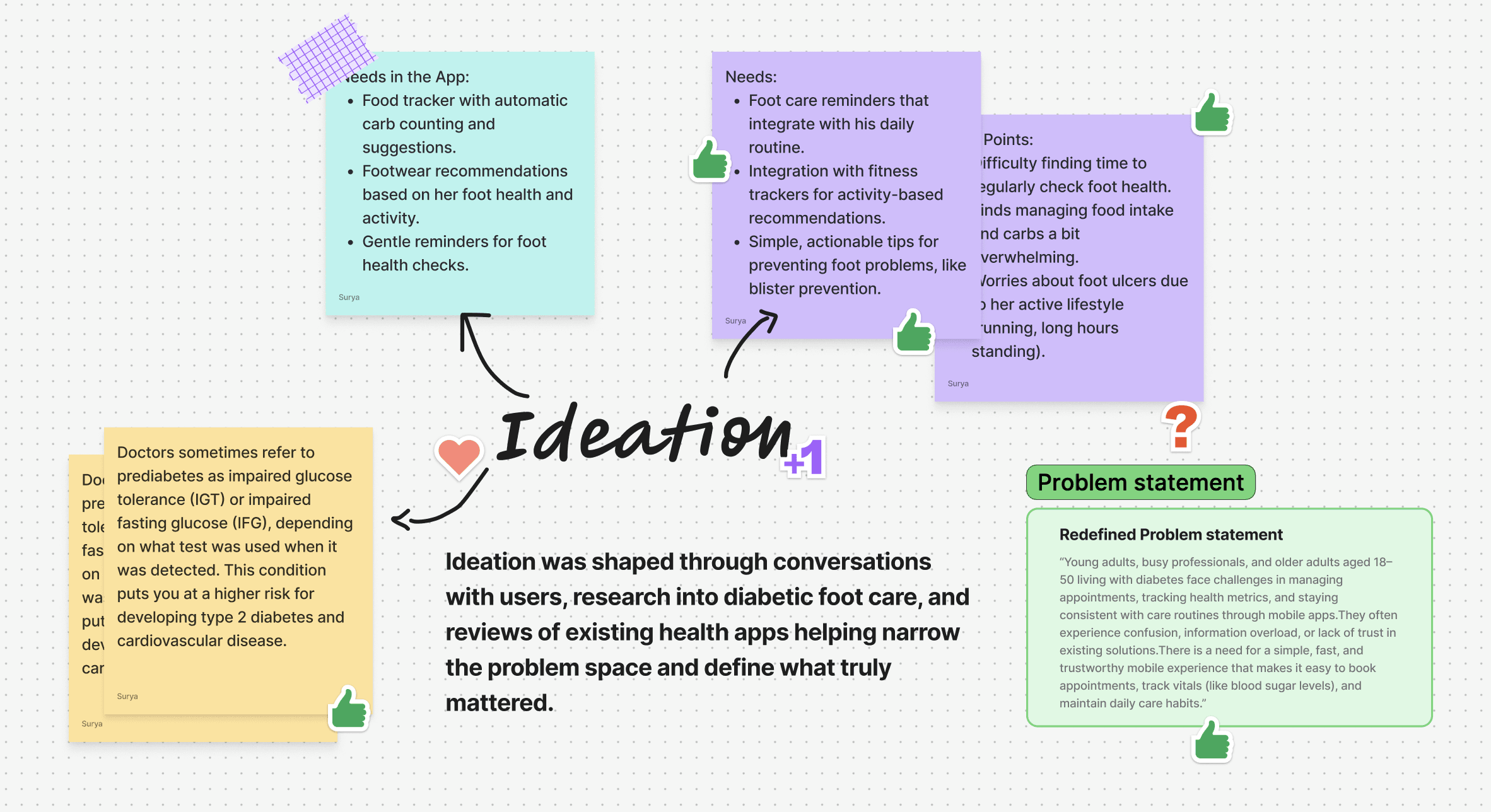 The board captures questions, constraints, and early directions explored before narrowing the solution.